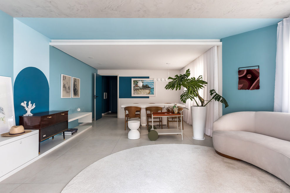 O casal tinha muitos artigos com história, como a vitrola e a cadeira de balanço que pertenciam à família. Quisemos destacá-los e usamos as formas e as cores para isso. Foram colocados na sala, um dos ambientes principais da casa. Escolhemos um degradê de azul, trazendo leveza e calma. Além disso, aproveitamos para brincar com os móveis, escolhendo aqueles com formas orgânicas e curvas.